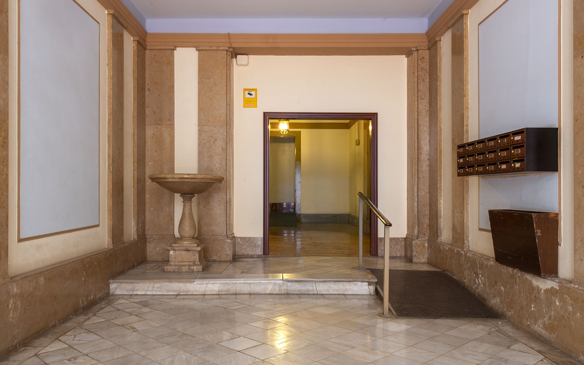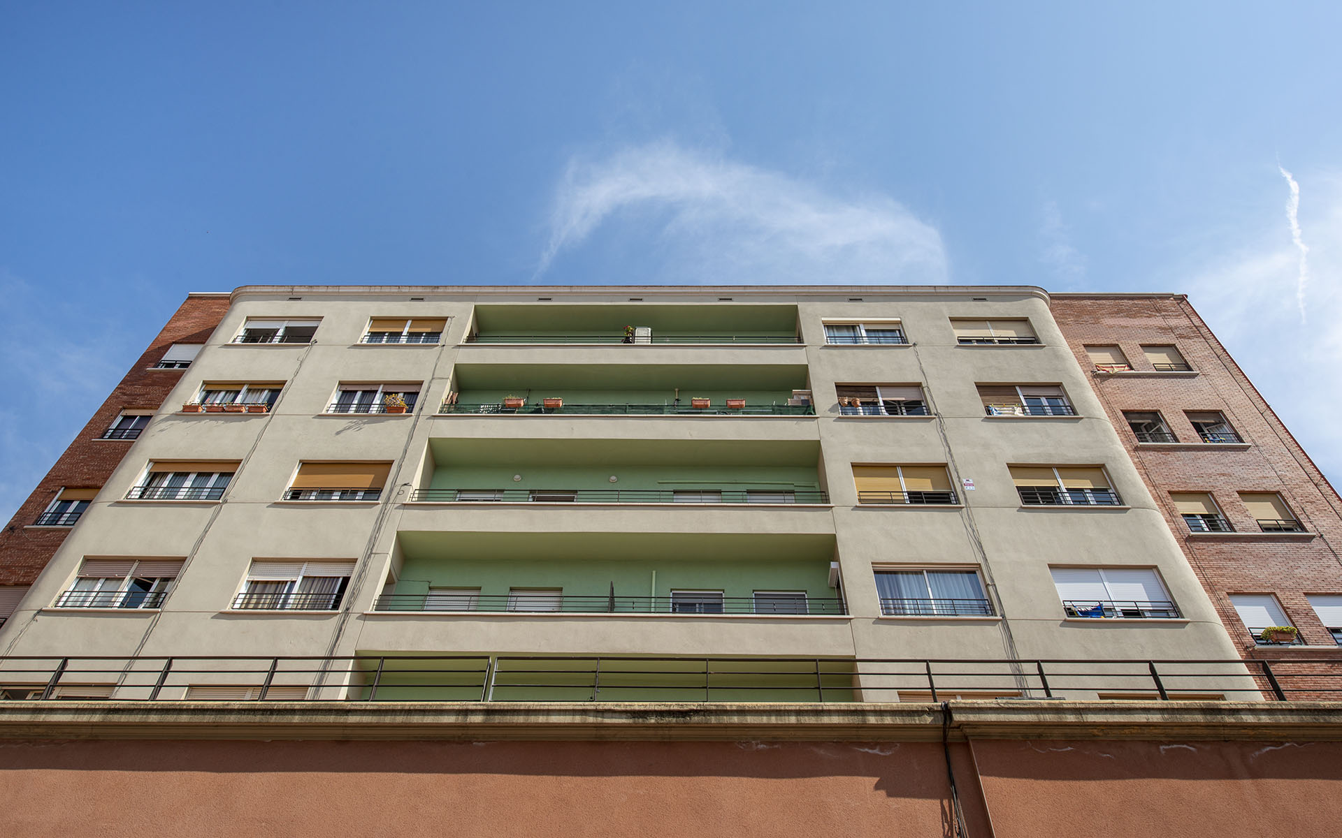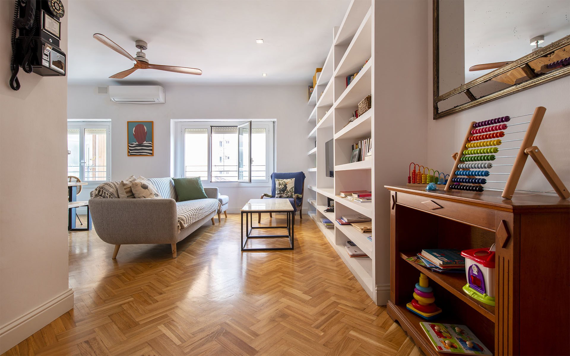 125m2 renovated apartment, on a third floor, in a building from the 40s with elevator. Access to this peculiar building is through a wide, clean hall, with well-chosen colors and noble materials. The staircase is circular around the elevator and the entrance to the apartments is through walkways creating visuals between the different floors. The corner apartment has a triangular shape, so it has no neighbors and it is all outward looking, except for one of the bedrooms. It has a spacious living-dining room, with large windows that overlook the interior block patio, facing northeast, lots of light and sun much of the morning. Three double bedrooms with built-in wardrobes, one of them with an en-suite bathroom with a bathtub. The other two bedrooms share a very large bathroom with a shower. The kitchen is independent, linear and with an area for a table for 4 people, it combines wood with a Silestone worktop and all the appliances are paneled, an induction hob and a stainless steel sink. Both the bathrooms and the kitchen ventilate to the outside. There is a pillar in the living room to which a closet has been attached that serves as a storage room or cleaning closet. White aluminum exterior carpentry with double glazing, wooden interior carpentry combining lively colors. Well-cared for reclaimed wooden flooring, smooth, neutral-colored stoneware in the kitchen and checkerboard in the bathrooms, blue vinyl flooring in the children's rooms. A custom-made, vintage-colored multifunction wardrobe in the dining room brings a lot of joy to the whole area. Radiators in all rooms, air conditioning in the living room and fans provide the necessary comfort, a gas boiler and newly installed water and electricity installations.