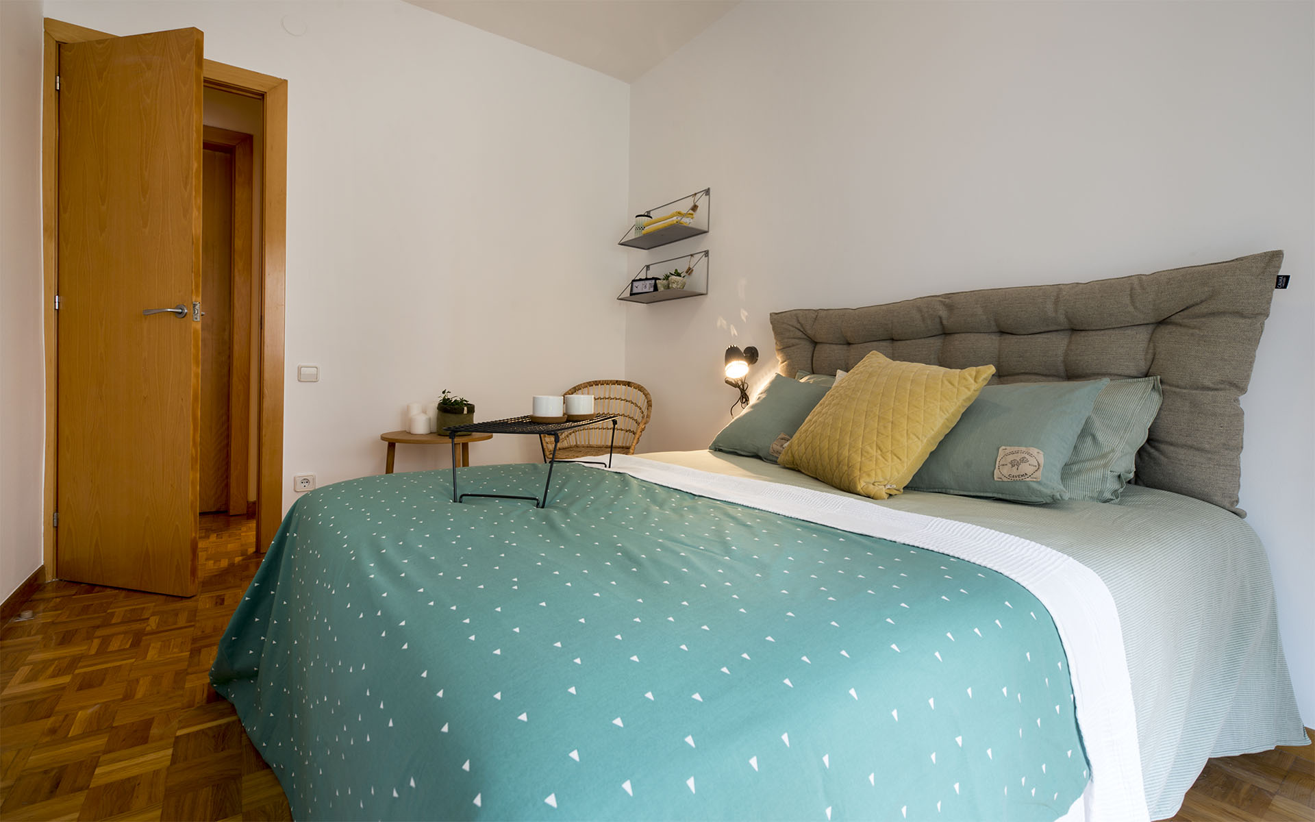 72m2 apartment on a fourth floor of a 70's building, with elevator, located on Nàpols Street, between Aragó and Consell de Cent. From the access door to the living room, and through a hallway, we find two single rooms that ventilate to the inner courtyard, and the kitchen with access to a laundry room. The living room is a 17m2 rectangular room with a large window and access to a balcony overlooking the street. Its northeast orientation provides nice morning light. From this room and through a small distributor we access the main bedroom, with access to the same balcony that provides natural light, an interior single room and a bathroom with shower. Smooth walls and parquet flooring in all rooms, except kitchen and bathroom. White aluminum exterior carpentry in the living room and the main room. Hot water is by city gas boiler. It has no heating.