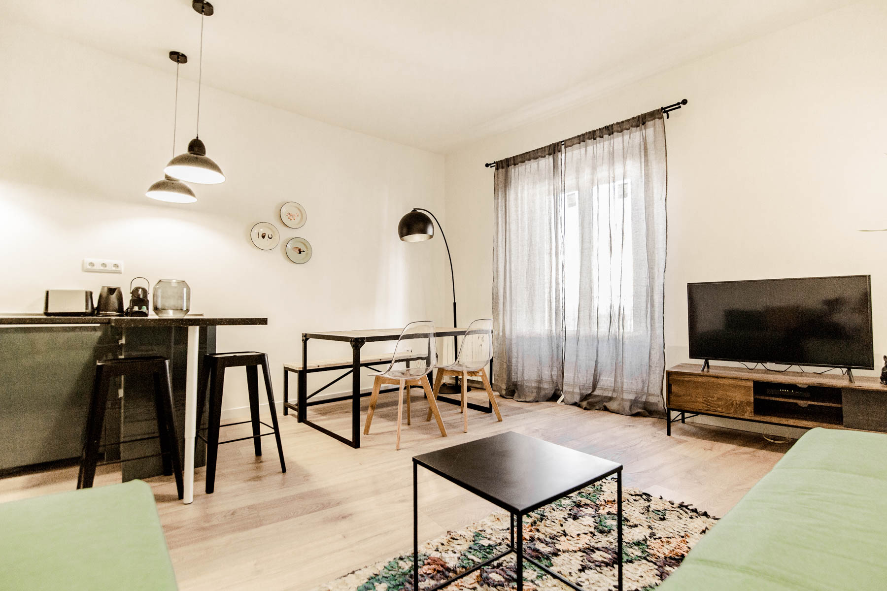 A great central space with the living-dining room and integrated kitchen, with beautiful wooden beams from the original architecture of the house, and a balcony facing Santa Isabel street. The living room includes a TV screen and a sofa bed. The kitchen is fully equipped (dishwasher too). An interior bedroom with a double bed, dressing room and a bathroom with shower tray and towel heater.