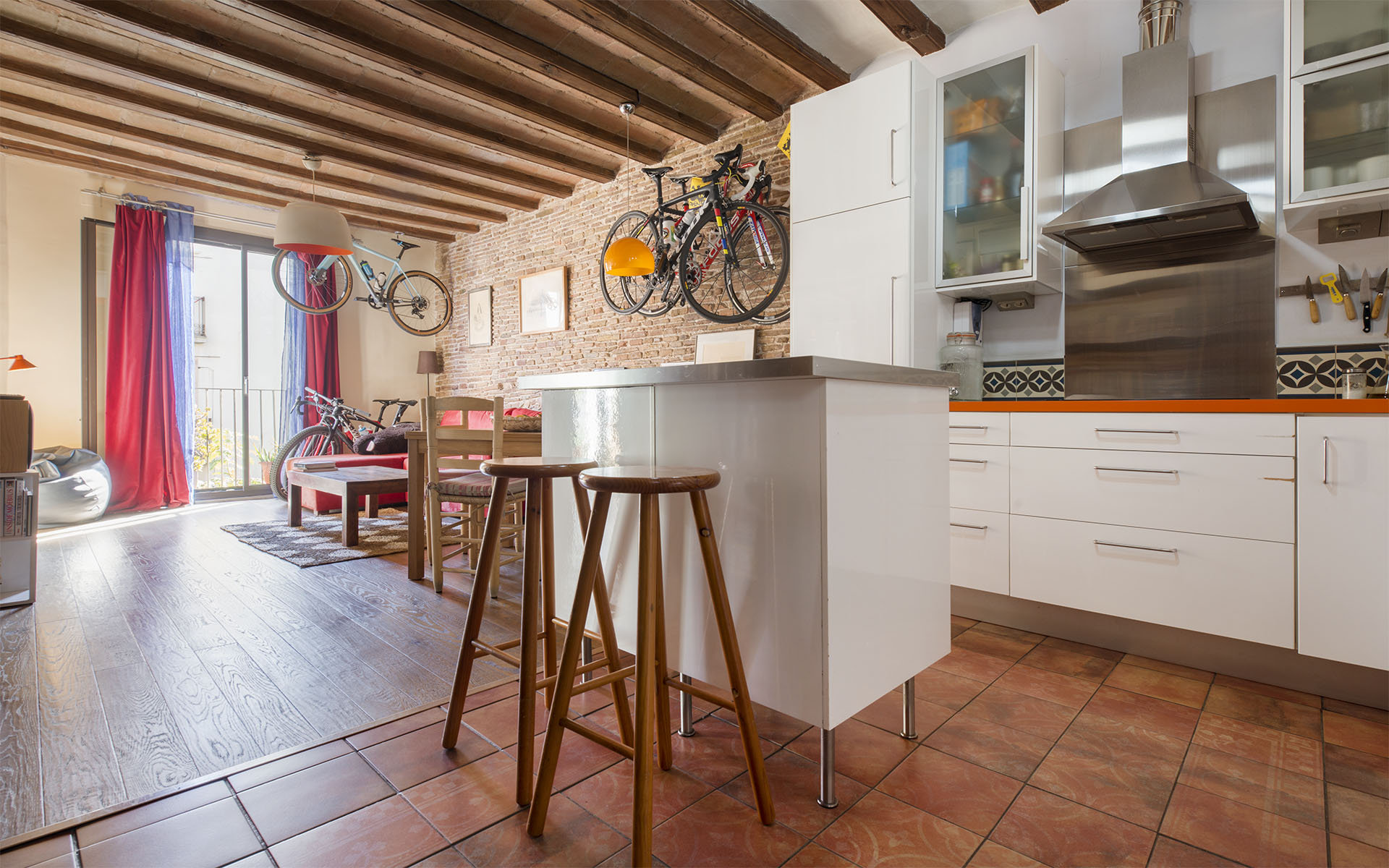 56 m² apartment on a fourth floor, without elevator, in a building located at the corner of Sant Pere Més Baix with Rec Comtal. The apartment was completely renovated in 2009. The flat is accessed from the central part where the living room and kitchen are located, which occupy a total area of 31.10m2. A southeast-facing balcony provides good light to this entire area. The kitchen completely open to the living room is furnished and fully equipped. From the living room we access the bedroom, generously sized and with another balcony providing natural light all day. At the other end, next to the main entrance of the apartment, we find the bathroom, equipped with a large shower with glass screen. An exposed brick wall in the living room is combined with the rest of the smooth walls. The floors combine natural wood and stoneware in living room-dining room-kitchen and bedroom. Ceilings with Catalan vault and exposed wooden beams. Exterior carpentry double thermal bridge in gray aluminum. Interior carpentry in wood. Gas boiler for domestic hot water. Heating by cold / heat pump (split in living room and bedroom).