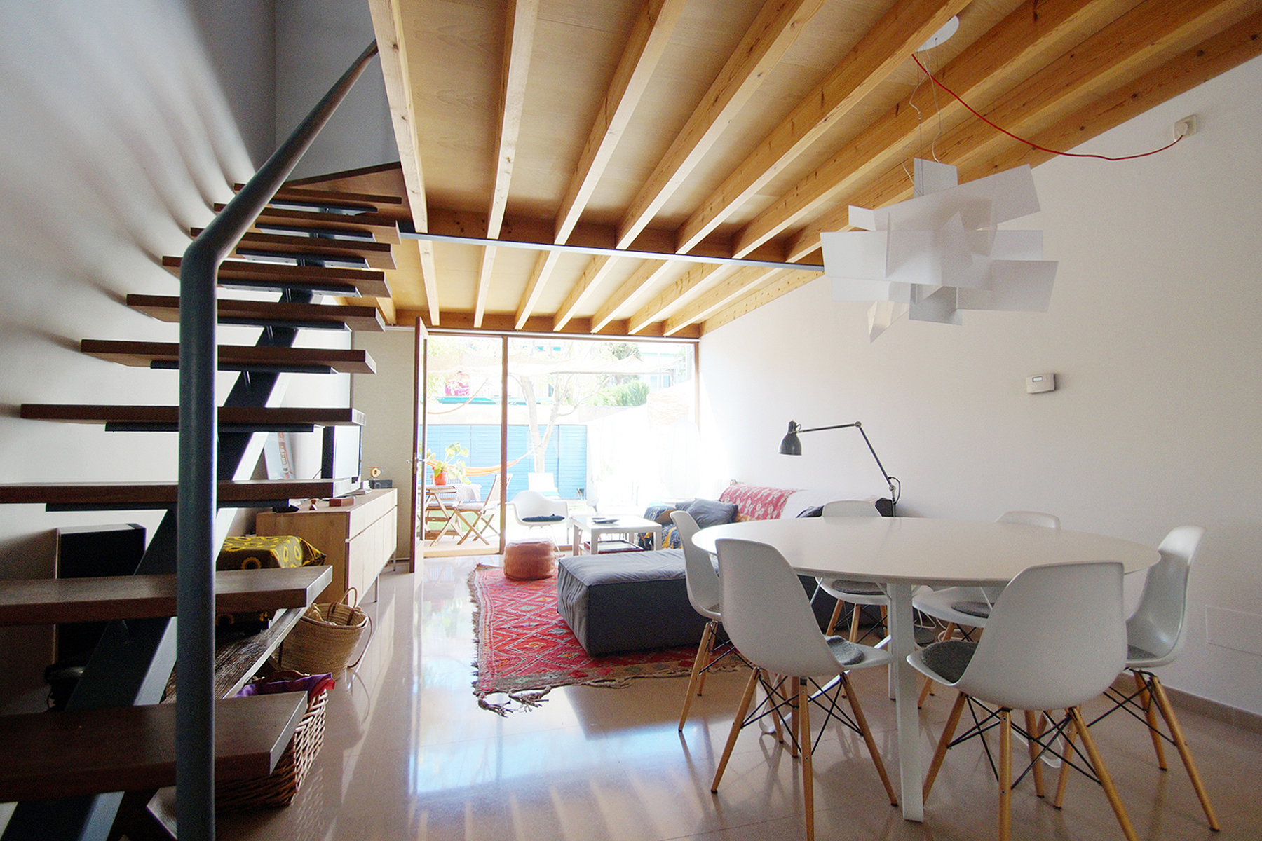 La casa tiene tres plantas que miran hacia un fantástico patio presente nada más entrar por la puerta principal. Se nota que los propietarios quieren esta vivienda, nos lo muestran los detalles, como la puerta corredera de la cocina, el suelo de terrazo pulido, las vigas de madera que combinan con las jácenas metálicas o la escalera que une los tres niveles de la casa con una baranda de tubo de hierro de color azul elegida con muy buen gusto.Y todo esto con la energía de un mobiliario muy personal, único para el disfrute de los huéspedes.