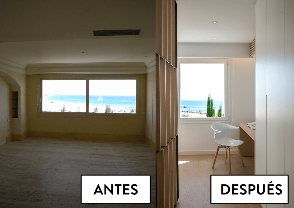 En planta segunda, donde había 3 habitaciones (2 individuales que compartían un baño y una habitación doble tipo suite) hoy hay 2 habitaciones individuales en una habitación doble con armarios empotrados y baño, y se reforma por completo la habitación principal.